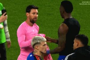 梅西先是和辛辛那提16号球员哈德贝换完球衣,随后和辛辛那提23号球员奥雷拉诺寒暄,之后奥雷拉诺脱下球衣给梅西。梅西似乎示意待会给他自己的球衣。