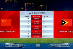 体育资讯11月24日讯 U17亚洲杯预选赛A组第二轮,中国队半场6-0领先东帝汶。数据统计显示,上半场形势完全一边倒。