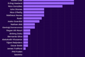 体育资讯10月31日讯 数据机构squakwa统计了本赛季曼城队内的英超成功争顶情况,哈兰德和鲁本-迪亚斯并列最多。